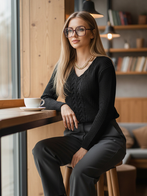 MUST HAVE w każdej jesienno-zimowej garderobie. Fason świetnie dopasowuje się do sylwetki. Rękawy wykończone zostały ściągaczami. Całość urozmaica ozdobny splot oraz dekolt w serek. Ten model fantastycznie sprawdzi się w codziennych, a także eleganckich stylizacjach. Świetnie zaprezentuje się w zestawieniu z botkami i kozakami. Produkt dostępny jest w kilku wariantach kolorystycznych.