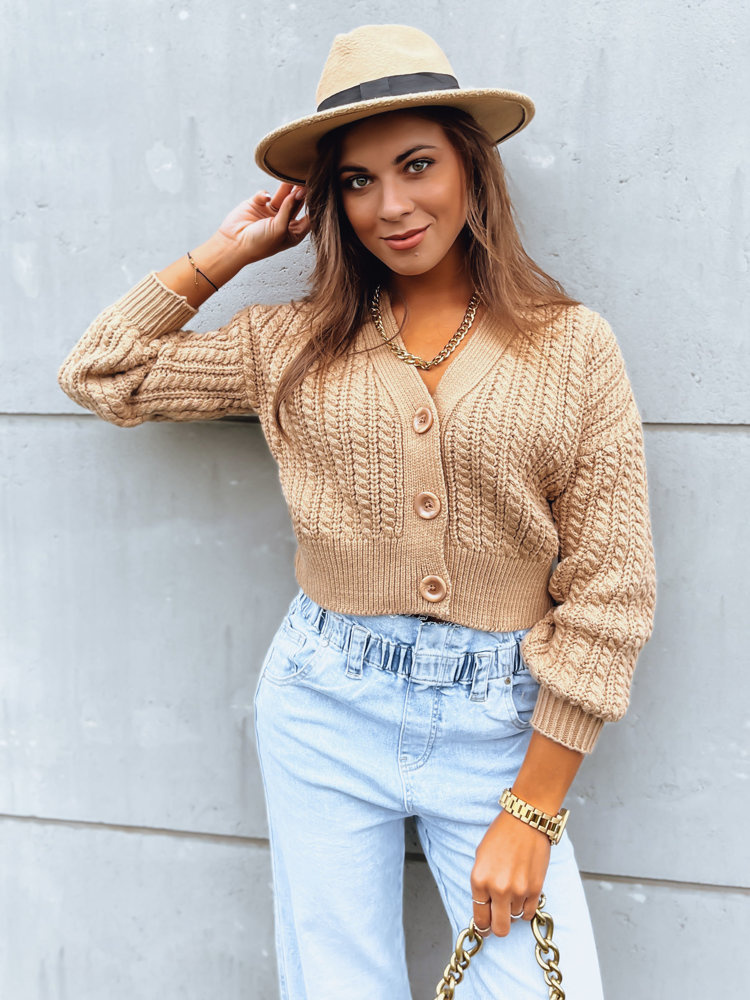 Sweter MINERWA o krótszym kroju to must have w twojej szafie. Ten model wyróżnia się przepięknymi splotami, oraz dekoltem w serek. Całość dopełniona jest stylowymi guzikami. Sweter posiada ściągacze na dole oraz na rękawkach, co zapewnia idealne dopasowanie i wygodę noszenia. Doskonale sprawdzi się jako dodatek do różnych stylizacji, nadając im wyjątkowego charakteru.
