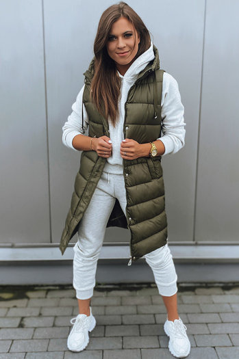 Kamizelka damska pikowana z kapturem długa MERIS ciemnozielona Dstreet TY4425
