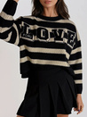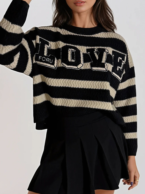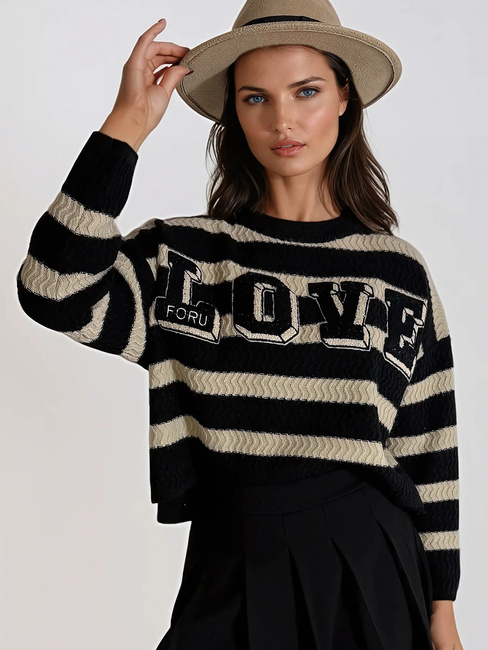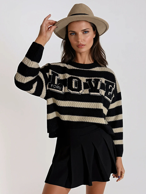 Sweter CHLOE to absolutny "must-have" w twojej garderobie. To wyjątkowa propozycja dla kobiet, które kochają modę i styl. Sweter ten łączy w sobie wiele modnych elementów, które nadają mu unikalny charakter. Ponadczasowe paski, które zdobią ten sweter, połączone z efektownym plecionym wzorem, tworzą modny i wyrazisty design idealny na jesień. Dodatkowo, na swetrze znajduje się naszywany napis "LOVE", co dodaje mu romantycznego akcentu. Sweter damski CHLOE to doskonały wybór dla tych, którzy pragną wyrazić swoją miłość do mody i stylu w jesiennej stylizacji.