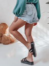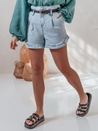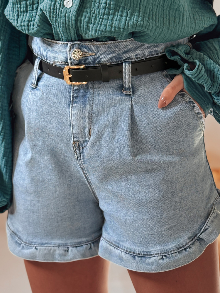 Damskie spodenki jeansowe o wysokim stanie, zapinane na klasyczny guzik i zamek, z uroczym wykończeniem nogawek w postaci subtelnej falbanki. Model wyposażony w ozdobne kieszenie z przodu i z tyłu oraz stylowy pasek w zestawie, który podkreśla talię. Idealne na wiosenne i letnie dni – sprawdzą się zarówno w miejskich, jak i wakacyjnych stylizacjach.