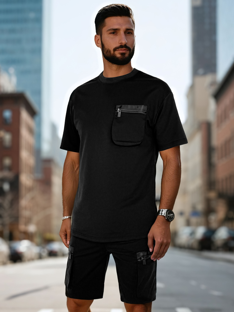 Dwuczęściowy męski komplet dresowy to propozycja z modnym charakterem. Koszulka z krótkim rękawem wyróżnia się ozdobną kieszenią na piersi, zapinaną na suwak. Zaokrąglony dekolt i dopracowany krój zapewniają komfort przez cały dzień. Spodenki typu cargo posiadają cztery kieszenie, miękki ściągacz w pasie oraz sznurek do regulacji. Całość wykonana z przyjemnego materiału, który świetnie sprawdza się w wiosenne dni, zarówno w mieście, jak i podczas aktywności.
